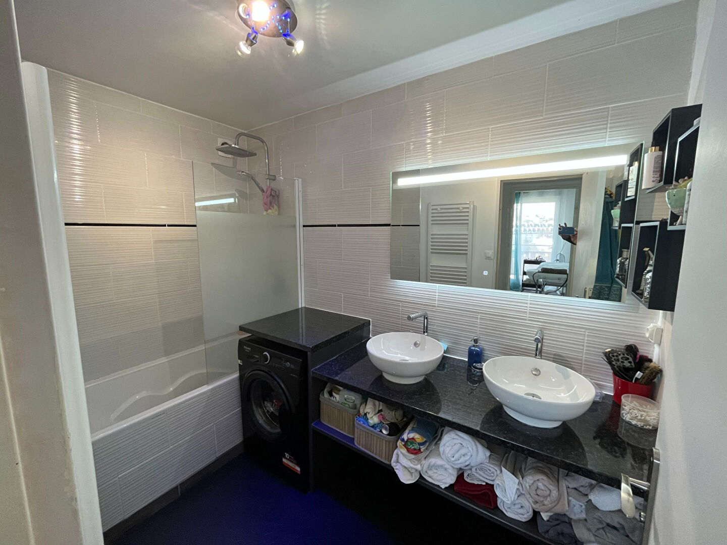 Une entrée avec grand dressing, un salon-séjour spacieux et lumineux, une cuisine récente aménagée et équipée, trois chambres, un débarras, une salle de bain et un WC, un balcon, une cave.