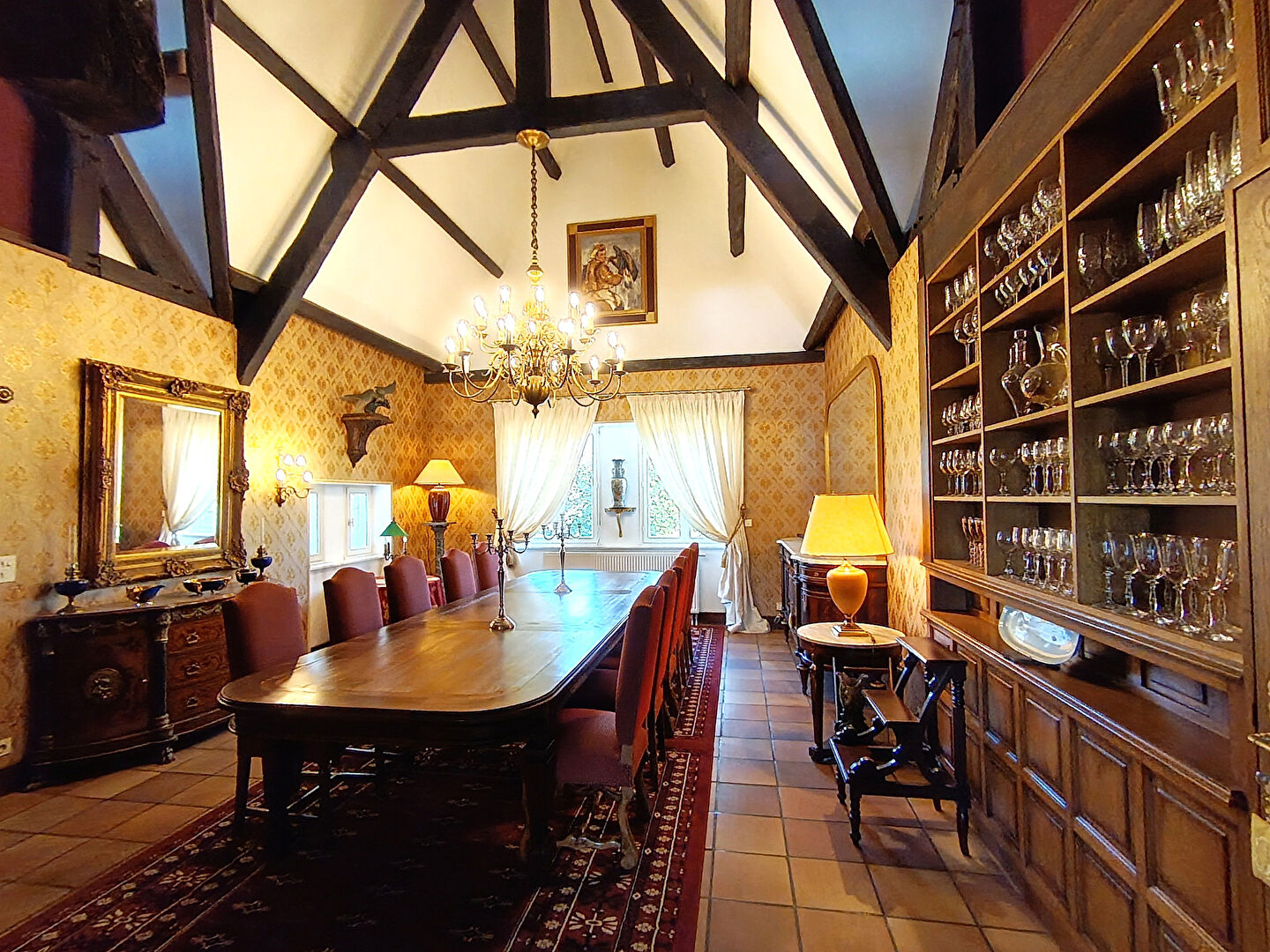 Les pièces de vie offrent une atmosphère chaleureuse, sublimée par une belle luminosité et des éléments de caractère tels qu’une cheminée en granit et des plafonds travaillés.